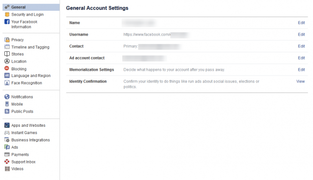 Log in to Facebook.com and click the little down arrow on the top right. Then click Settings. If you ever get lost during this guide, you can get back to where you need to be by coming back to this point.