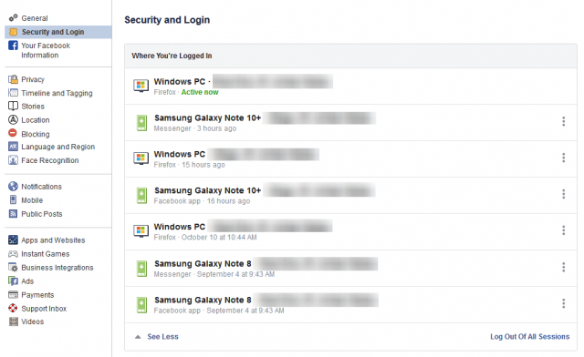 First, Facebook will show you all of the recent devices logged into your account. It will show you approximately where geographically the device was, the browser used, and when it was last active. Obviously, if you see something suspicious here, you should change your password right away (the options for that are directly below). Additionally, you can click the 3-dot icon on the right next to any login and log that device out.