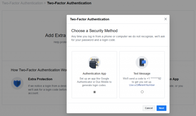 Then, from Facebook on your computer (see the above screenshot), select Authentication App and click Next.