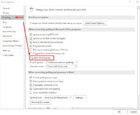 Some words and phrases simply aren’t identified as “spelled right” by Word, no matter how many times you use them. In cases like this, you can add custom words to the spell check dictionary so that they don’t waste even more of your time moving forward. You can add words by going through the File menu and clicking on Options. Once this window appears, you can click on Proofing.