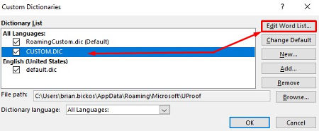 When the dictionary list pops up, select CUSTOM.DIC and click on the Edit Word List option. You’ll be able to make changes to your custom dictionary in this way.