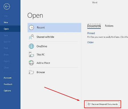 We’ve all been in a situation where we have lost progress on specific files due to a power outage or similar disaster, like an unexpected hardware crash. Thankfully, there is a way to save your hard work if you haven’t had the opportunity before the crash happens. In Word, navigate to the Open menu. At the bottom of this page, you’ll see a button that gives you the ability to recover unsaved documents.